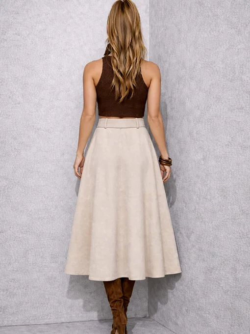 Φούστα closs αλκαντάρα. Αέρινη και κομψή, με ζώνη στο ίδιο ύφασμα και λάστιχο στο πίσω μέρος της μέσης