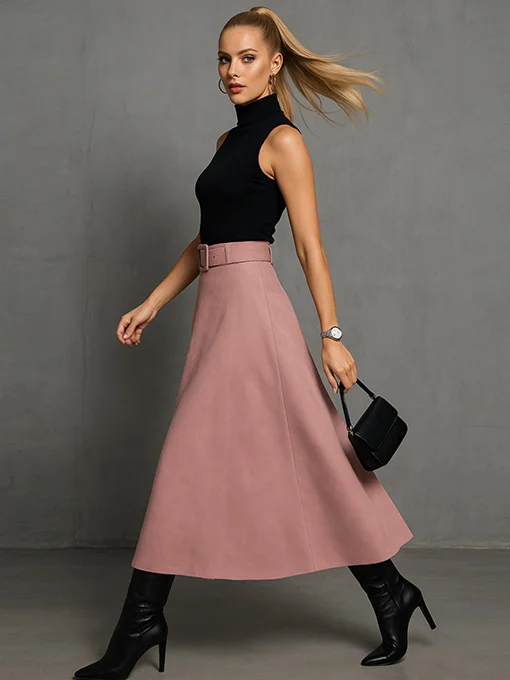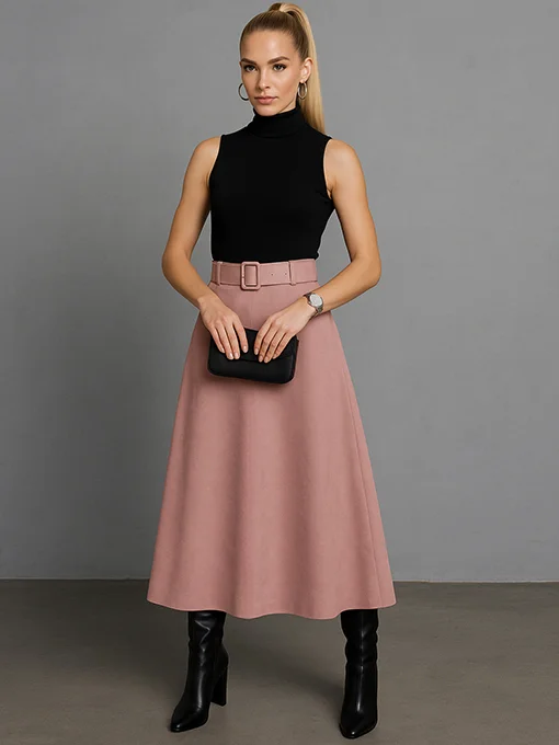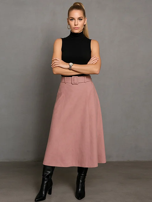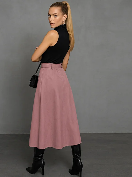 • Φούστα closs αλκαντάρα. Αέρινη και κομψή, με ζώνη στο ίδιο ύφασμα και λάστιχο στο πίσω μέρος της μέσης