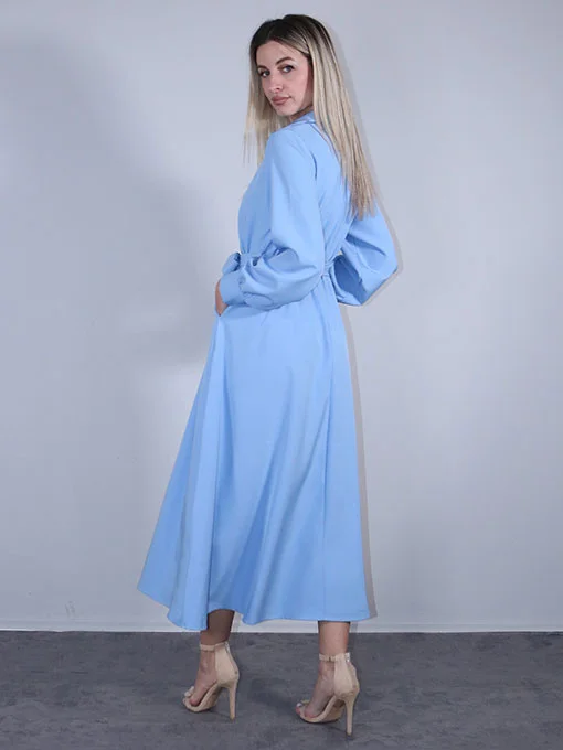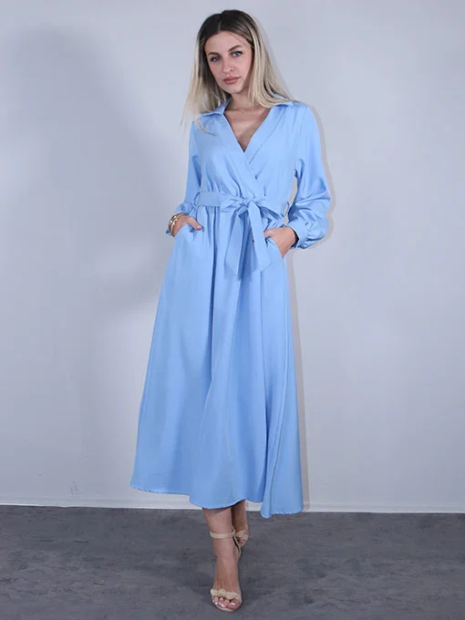Φόρεμα κρουαζέ με γιακά, αποσπώμενη ζώνη και λάστιχο στην μέση.