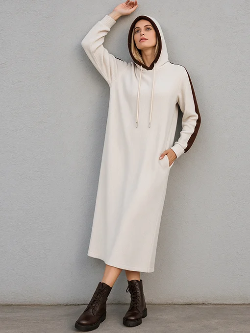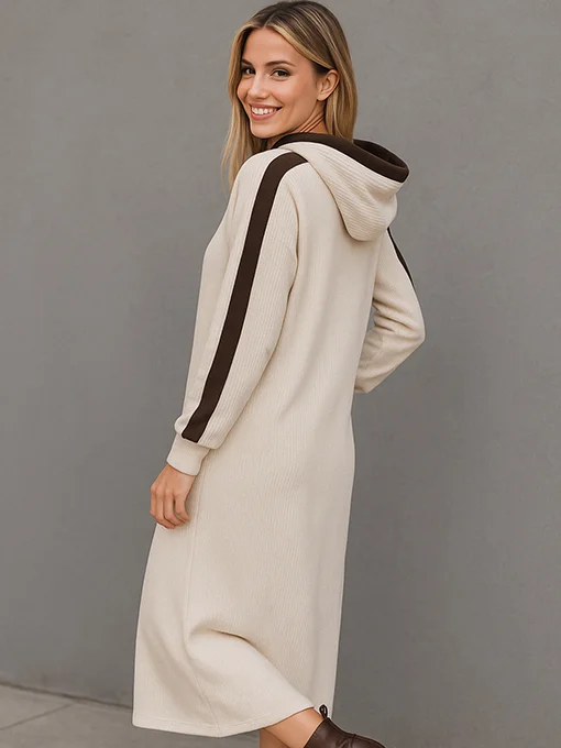 Φόρεμα κοτλέ βελουτέ. Διαθέτει κουκούλα και τσέπες. Τα μανίκια έχουν κάθετη εκρού ρίγα που χαρίζει sporty και μοντέρνο ύφος. Το ύφασμα είναι μαλακό, ζεστό και ελαφρώς ελαστικό, ιδανικό για all day εμφανίσεις.