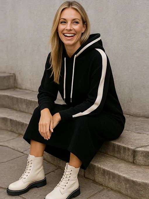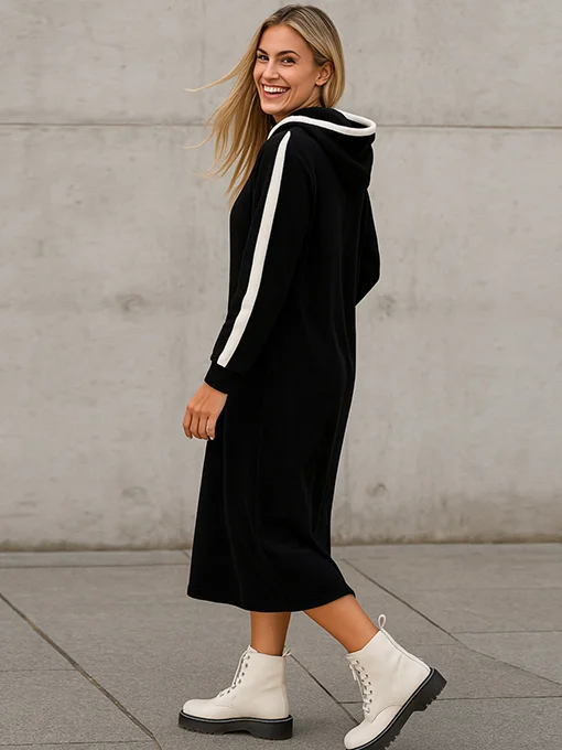 Φόρεμα κοτλέ βελουτέ. Διαθέτει κουκούλα και τσέπες. Τα μανίκια έχουν κάθετη εκρού ρίγα που χαρίζει sporty και μοντέρνο ύφος. Το ύφασμα είναι μαλακό, ζεστό και ελαφρώς ελαστικό, ιδανικό για all day εμφανίσεις.