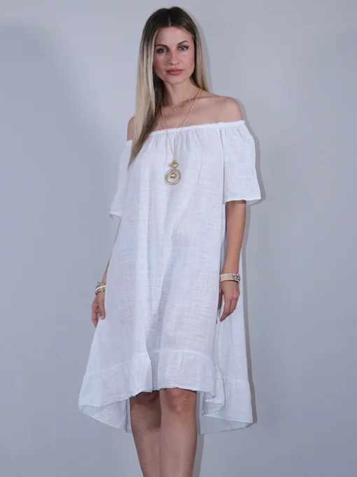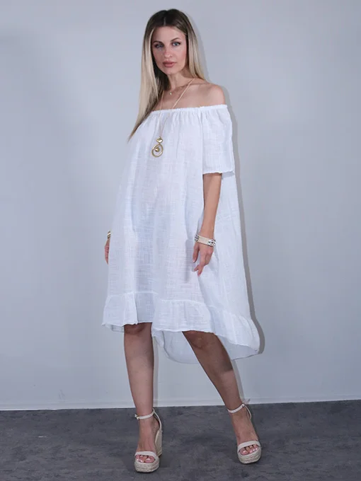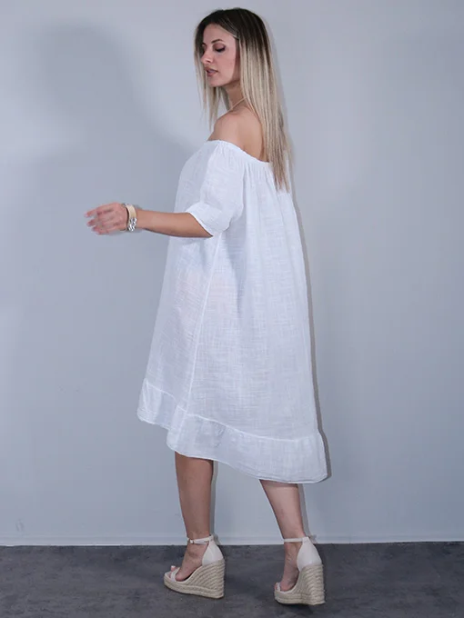 Φόρεμα λινό ασύμμετρο, πολύ φαρδύ με λάστιχο που κατεβαίνει στους ώμους.