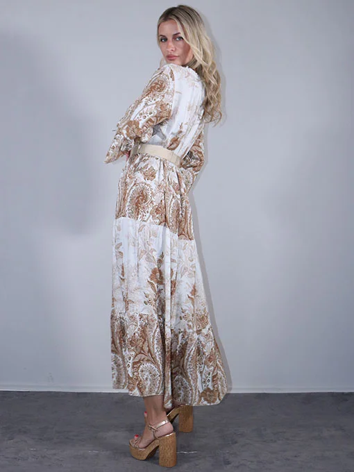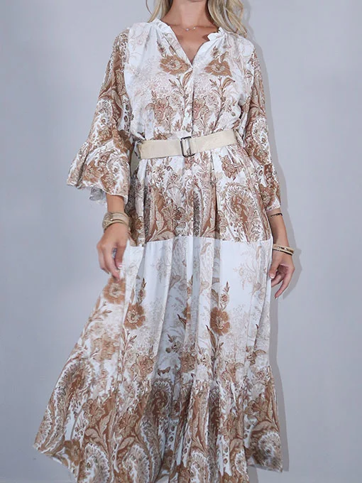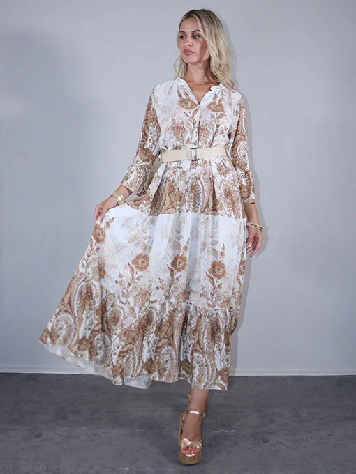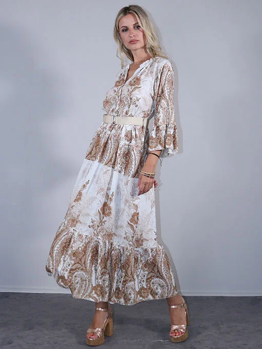 Φόρεμα μακρύ εμπριμέ με ζώνη και βολάν στα μανίκια και κάτω.
