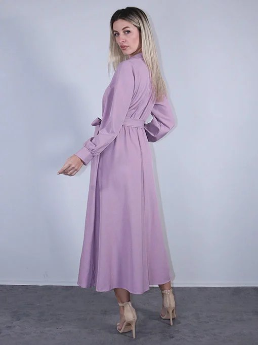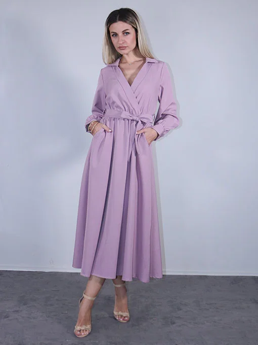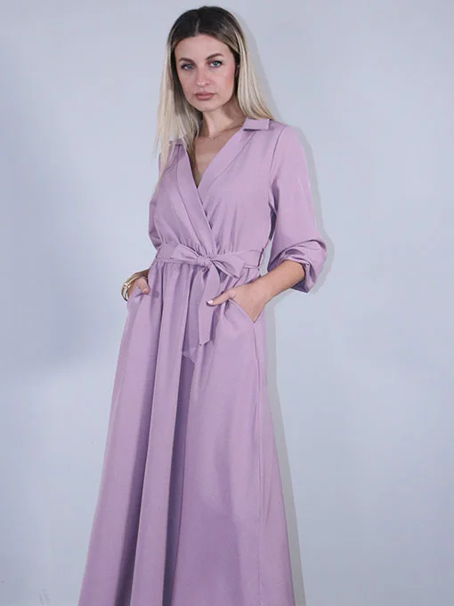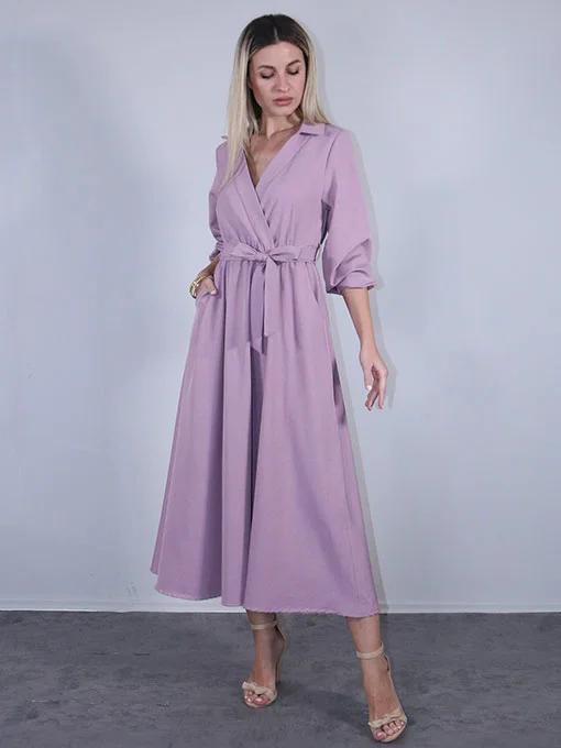 Φόρεμα κρουαζέ με γιακά, αποσπώμενη ζώνη και λάστιχο στην μέση.