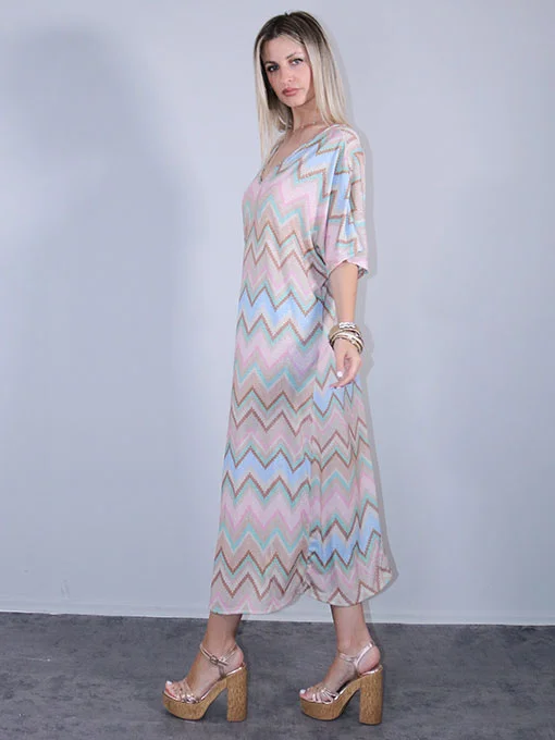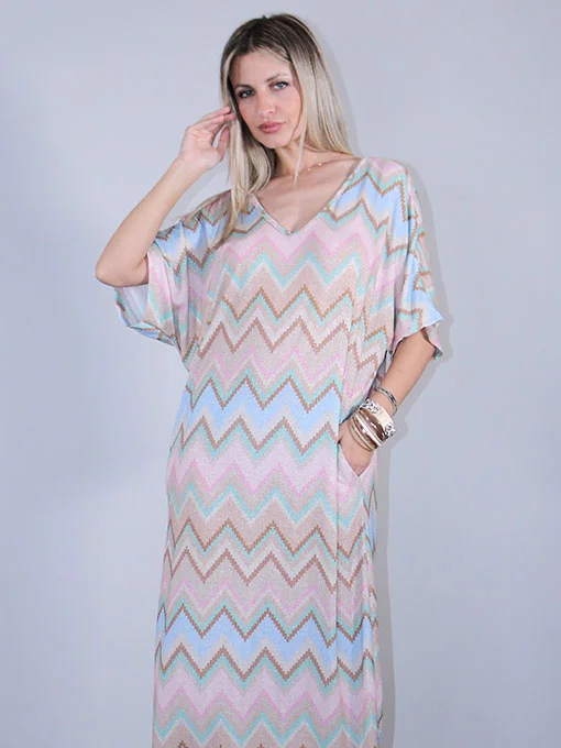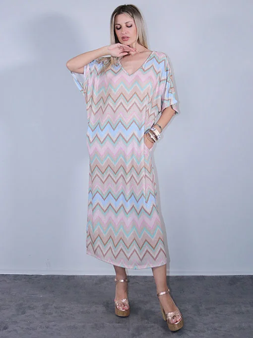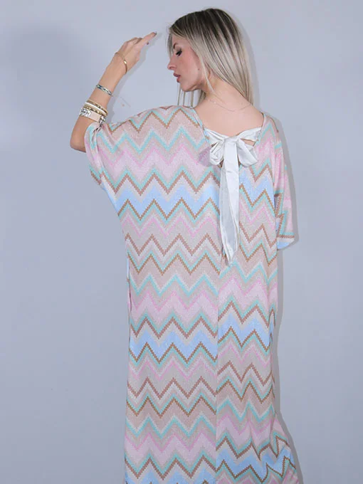 Φόρεμα boho μάξι πολύ φαρδύ και ελαστικό, με πολύχρωμο γεωμετρικό τύπωμα και σατέν κορδέλα που δένει στην πλάτη.