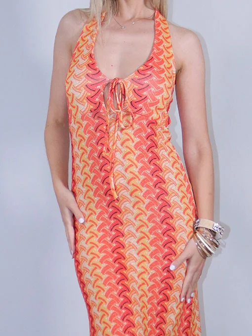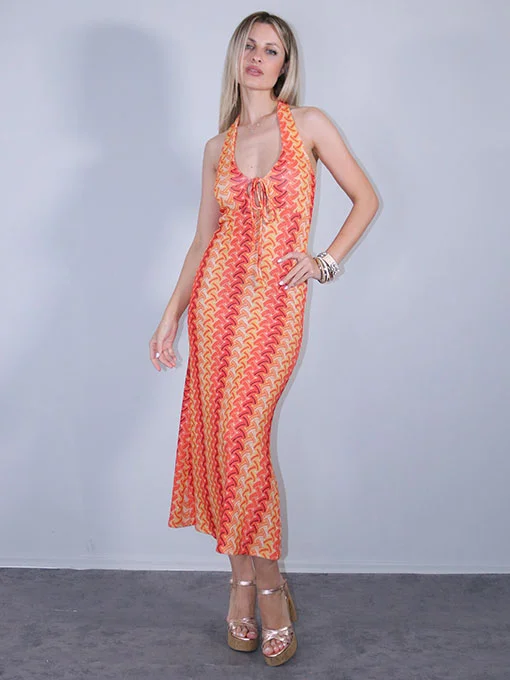 • Φόρεμα boho πολύ ελαστικό με πολύχρωμο γεωμετρικό τύπωμα. Δένει στο στήθος και πίσω από τον λαιμό