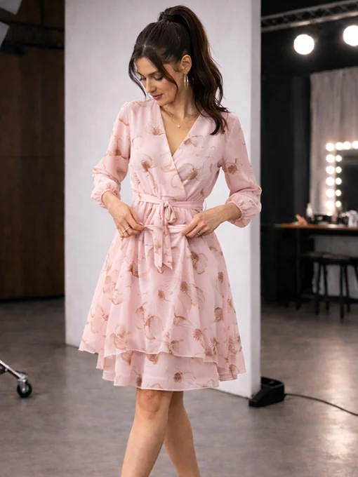 Το κρουαζέ σχέδιο δημιουργεί όμορφη γραμμή στο μπούστο, ενώ η ελαστική μέση αγκαλιάζει άνετα το σώμα και συνοδεύεται από ζώνη στο ίδιο ύφασμα για τέλεια εφαρμογή.