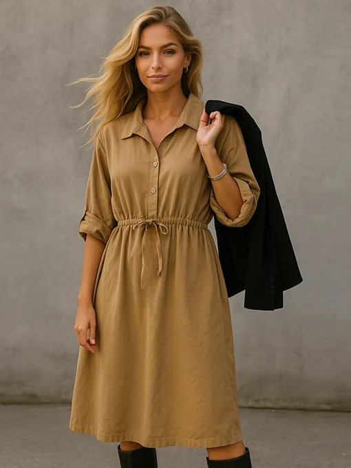 Λεπτό κοτλέ βαμβακερό με μαλακή πτώση, ενώ το ζωνάκι στη μέση τονίζει τη σιλουέτα χωρίς να τη στενεύει. Συνδυάζεται εύκολα με μποτάκια, sneakers ή loafers για ένα all-day look που αποπνέει απλότητα, φινέτσα και αυτοπεποίθηση.
