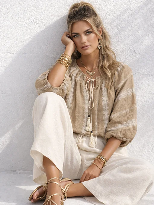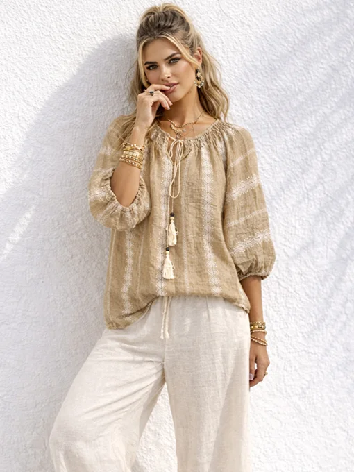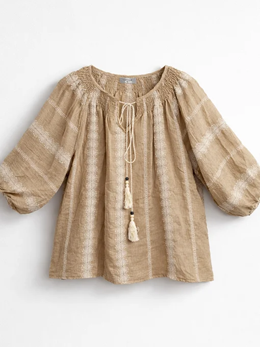 Αέρινη μπλούζα με διακριτικά κεντήματα και κορδόνι με φούντες στο ντεκολτέ. Χαλαρή γραμμή και μανίκια 3/4 που προσφέρουν άνεση και κομψότητα, ιδανική για boho και καλοκαιρινά looks.