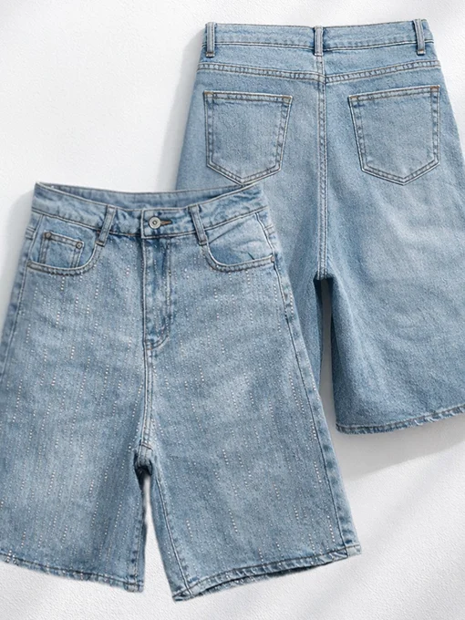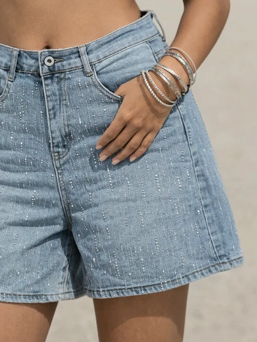 Μοντέρνα τζιν βερμούδα με λαμπερές λεπτομέρειες strass στο μπροστινό μέρος. Συνδυάζεται εύκολα και χαρίζει stylish, θηλυκό αποτέλεσμα με fashion χαρακτήρα.