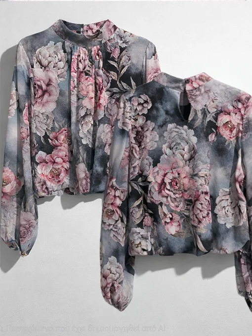 Αέρινη μπλούζα από ανάλαφρο σιφόν με ρομαντικό floral ντεσέν. Το κάτω μέρος γυρίζει προς τα μέσα δημιουργώντας μπαλού εφέ. Συνδυάζεται άψογα με pencil παντελόνια και γόβες για sophisticated αποτέλεσμα.