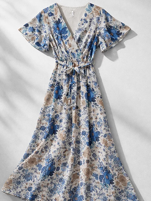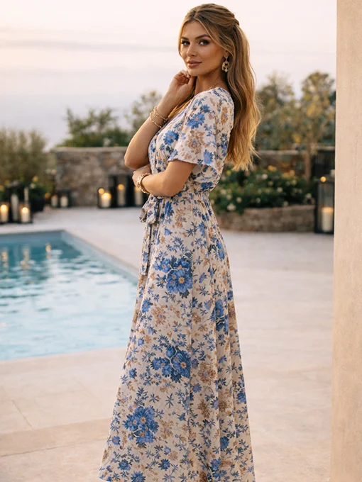 Αέρινο maxi φόρεμα με φλοράλ σχέδιο, κρουαζέ ντεκολτέ και κοντό φαρδύ μανίκι. Διαθέτει φόδρα στο εσωτερικό & υφασμάτινο ζωνάκι στη μέση για θηλυκή εφαρμογή και ανάλαφρη γραμμή.