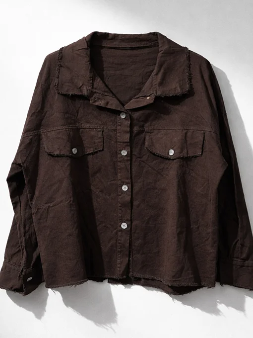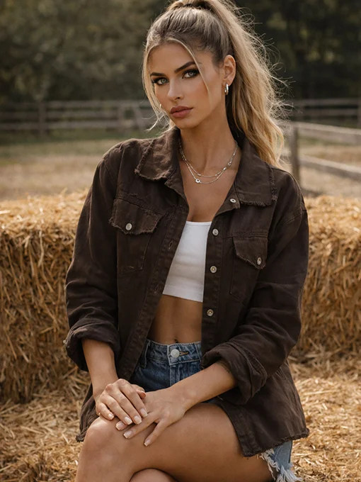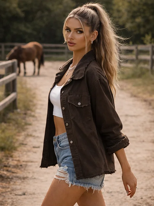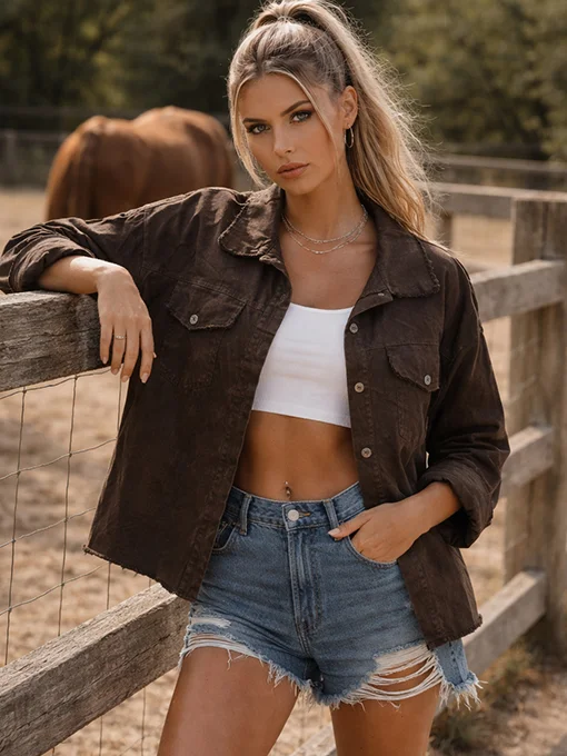 • Casual jacket σε denim υφή με γιακά, κουμπιά μπροστά και διακοσμητικές τσέπες. Οι ξέφτι λεπτομέρειες χαρίζουν μοντέρνο, edgy ύφος, ενώ η άνετη γραμμή το κάνει ιδανικό για καθημερινά και fashion looks.