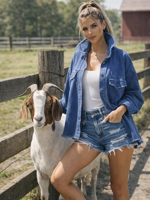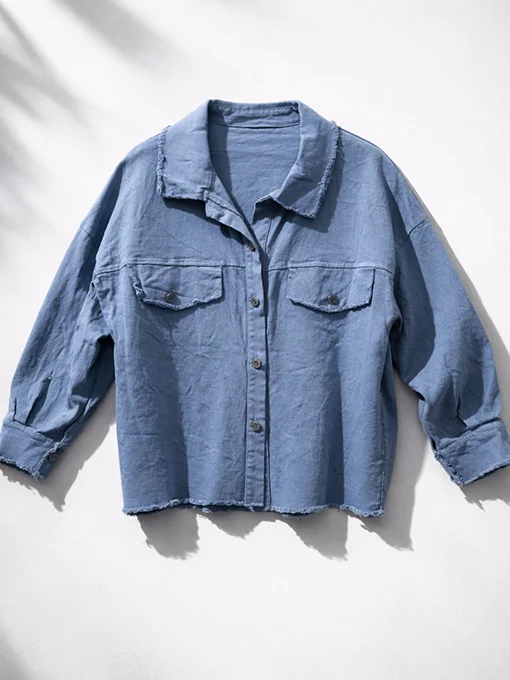 Casual jacket σε denim υφή με γιακά, κουμπιά μπροστά και διακοσμητικές τσέπες. Οι ξέφτι λεπτομέρειες χαρίζουν μοντέρνο, edgy ύφος, ενώ η άνετη γραμμή το κάνει ιδανικό για καθημερινά και fashion looks.