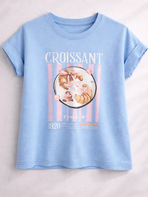 Βαμβακερό T-shirt με ρομαντικό croissant print και γαλλικό ύφος. Ιδανικό για casual εμφανίσεις με τζιν ή σορτς, από το πρωί έως το βράδυ.