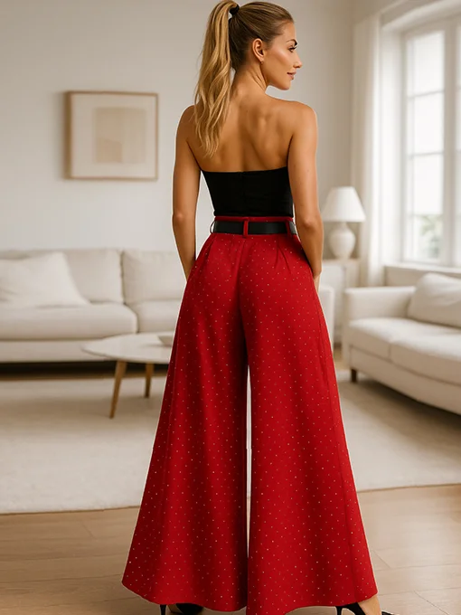 Η wide-leg παντελόνα με στρασάκια είναι το απόλυτο statement κομμάτι για εντυπωσιακές εμφανίσεις. Με εξαιρετικά φαρδιά γραμμή που ανοίγει απόλυτα προς τα κάτω. Διαθέτει διακριτικές λάμψεις με στρας σε όλη την επιφάνεια και φαρδιά μαύρη ζώνη με χρυσή αγκράφα.